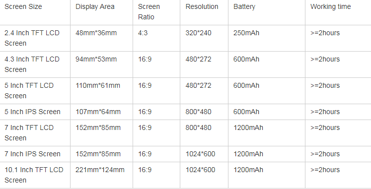 320*240p(TN screen),480*272p(TN screen),800*480p(TN screen),1024*600p(TN screen),800*480p(IPS screen),1280*800p(IPS screen)